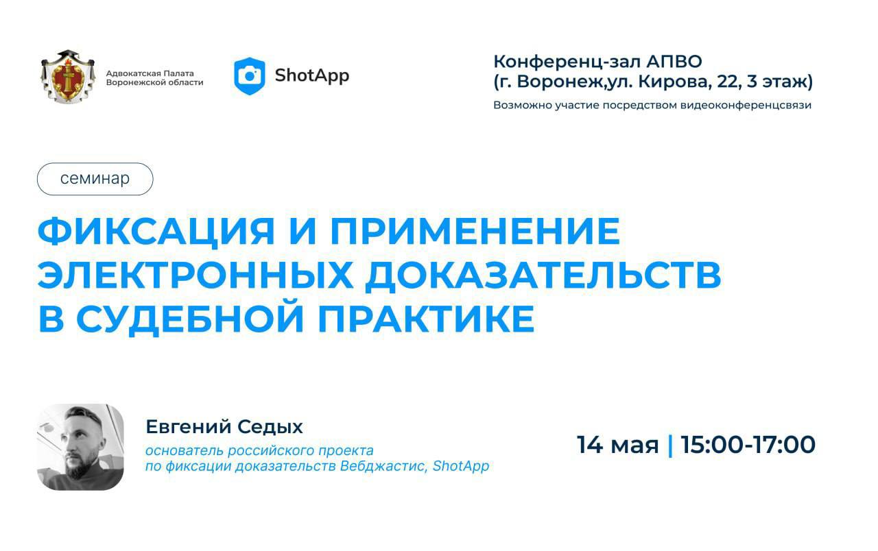 Уже в следующую среду, 14 мая, пройдёт семинар в АПВО на тему: «Фиксация и применение электронных доказательств в судебной практике».
